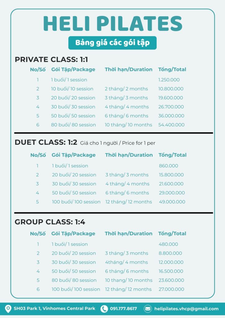Heli Pilates thường xuyên triển khai các chương trình khuyến mãi trong từng thời điểm dành cho khách hàng mới và khách hàng thân thiết. Để không bỏ lỡ những ưu đãi phù hợp nhất với nhu cầu và lộ trình tập luyện của bạn, vui lòng liên hệ trực tiếp với đội ngũ tư vấn của chúng tôi. Nhân viên sẽ hỗ trợ cập nhật chương trình khuyến mãi hiện hành và tư vấn gói tập tối ưu nhất cho bạn.